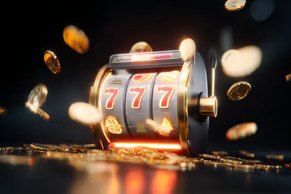 A dramatic shot of winning sevens landing on a slot reel surrounded by shining gold coins, symbolizing big wins.